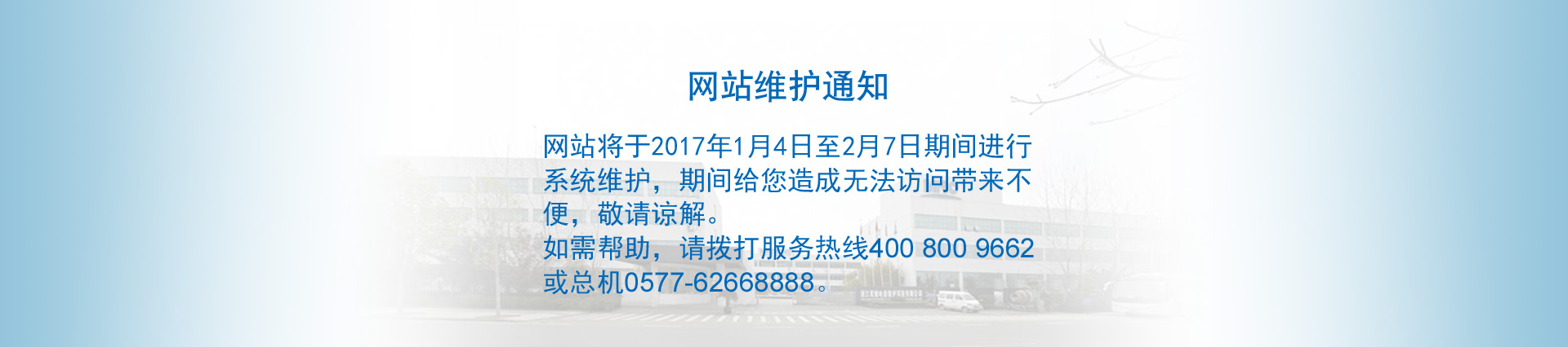 因系統(tǒng)升級,本公司網(wǎng)站將于2017年1月4日至2017年2月6日進(jìn)行維護(hù)。期間將無法訪問本公司網(wǎng)站。如有其他需要,請撥打服務(wù)熱線4008009662或總機0577-62668888咨詢。給各位造成不便,敬請諒解。