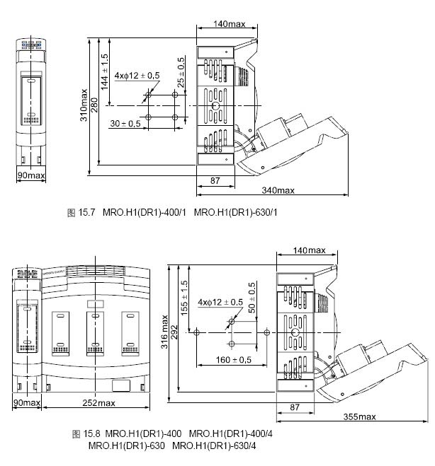 開關(guān)有底座和罩殼(載熔裝置)兩部分組成,呈封閉結(jié) 構(gòu),正面操作,通過罩殼上的透明板,可以直接觀察配裝的熔 斷體額定數(shù)據(jù)及指示件的動作狀態(tài),開關(guān)配裝相應(yīng)尺碼的熔斷 體;其中MRO.H1(DR1)-100/1 為單極,可相互拼裝,分別派 生為三、四極,可配裝000 尺碼的熔斷體,結(jié)構(gòu)經(jīng)濟,緊湊, MRO.H1(DR1)-160/1 為單極和MRO.H1(DR1)-160 為三極并列 結(jié)構(gòu),兩種結(jié)構(gòu)都能配裝000 和00 兩種尺碼的熔斷體;MRO. H1(DR1)-250/1、MRO.H1(DR1)-400/1、MRO.H1(DR1)-630/1 為單極和MRO.H1(DR1)-250、MRO.H1(DR1)-400 、MRO. H1(DR1)-630 為三極并列結(jié)構(gòu),分別配裝尺碼為1、2、3 的熔斷體。 以上的三極與同型號的單極拼裝,可派生為四極。 開關(guān)具有體積小巧、使用安全可靠、熔斷體卸裝方便、操作 力小等優(yōu)點。