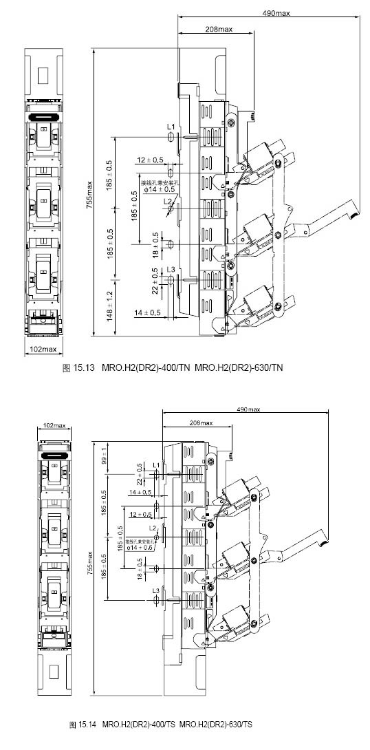 開關(guān)由底座和罩殼( 載熔裝置) 兩部分組成,呈三相封閉式 結(jié)構(gòu),正面操作,通過罩蓋上的透明板,可以直接觀察配裝的熔 斷體額定數(shù)據(jù)及指示件動作狀態(tài)。 開關(guān)安裝方式:開關(guān)實(shí)施模塊化設(shè)計(jì)。MRO.H2(DR2)-160/L 寬度為52mm,利用開關(guān)的進(jìn)線可以直接安裝在185mm 的母排 系統(tǒng)上,分為上出線或下出線二種型式,可三極同時(shí)分合,也可 三相單獨(dú)分合,可以配裝尺碼為000 或00 任一種熔斷體。 MRO.H2(DR2)-400/MRO.H2(DR2)-250 寬度為102mm,利 用開關(guān)的進(jìn)線可以直接安裝在185mm 的母排系統(tǒng)上,也可以利 用二個(gè)12x18 的安裝孔固定在支架上,二種安裝方式都具有上出 線或下出線二種型式,可三極同時(shí)分合,也可三極單獨(dú)分合,配 裝尺碼為1 或2 的熔斷體;MRO.H2(DR2)-630 寬度為102mm, 利用開關(guān)的進(jìn)線可以直接安裝在185mm 母排系統(tǒng)上,也可以利 用二個(gè)12x18 的安裝孔固定在支架上,二種安裝方式都具有上出 線或下出線二種型式,可三極同時(shí)分合,也可三極單獨(dú)分合,配 裝尺碼為3 的熔斷體; 開關(guān)具有占用安裝空間小、使用安全可靠、熔斷體裝卸方便、 操作力小等優(yōu)點(diǎn)。