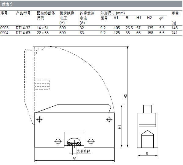 其中RT18N、RT18B 在同一外形尺寸的底座上,可供用戶選擇配置五種不同尺碼的熔斷體;RT18N 有兩路進出線,一路配置相